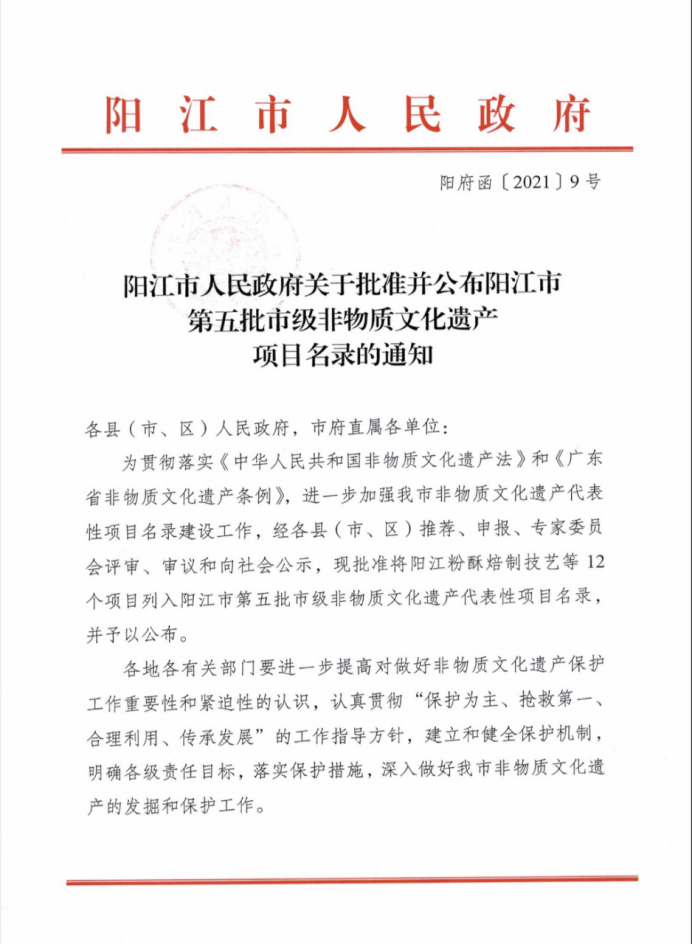 陽江粉酥焙制技藝是一項以炒米粉為主要材料,通過烘焙制作而成的一項傳統餅類食品制作技藝。由陽江人民在生活和習俗中產生、傳承和發展。陽江粉酥焙制技藝有選料、炒米、磨粉、配料拌合、上印制作、烘焙、起焙裝缸工序。