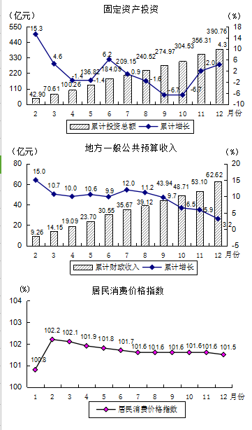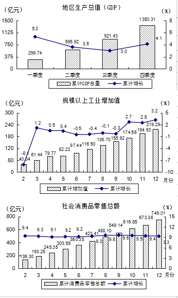 1-12月,全市經濟運行保持總體平穩,實現地區生產總值1350.31億元,同比增長4.1%。其中,第一、二、三產業分別增長3.2%、2.9%和5.7%。主要經濟指標情況如下: